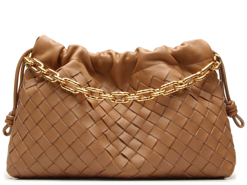 Bolsa Média Couro Corrente Tresse Enfeites Tiracolo Camel
