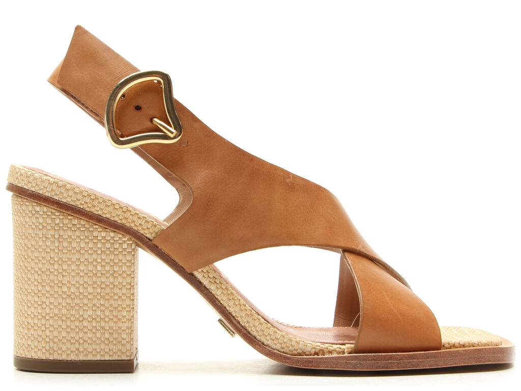 Sandalia Salto Alto Quadrado Tiras Couro Fivela Palha Camel