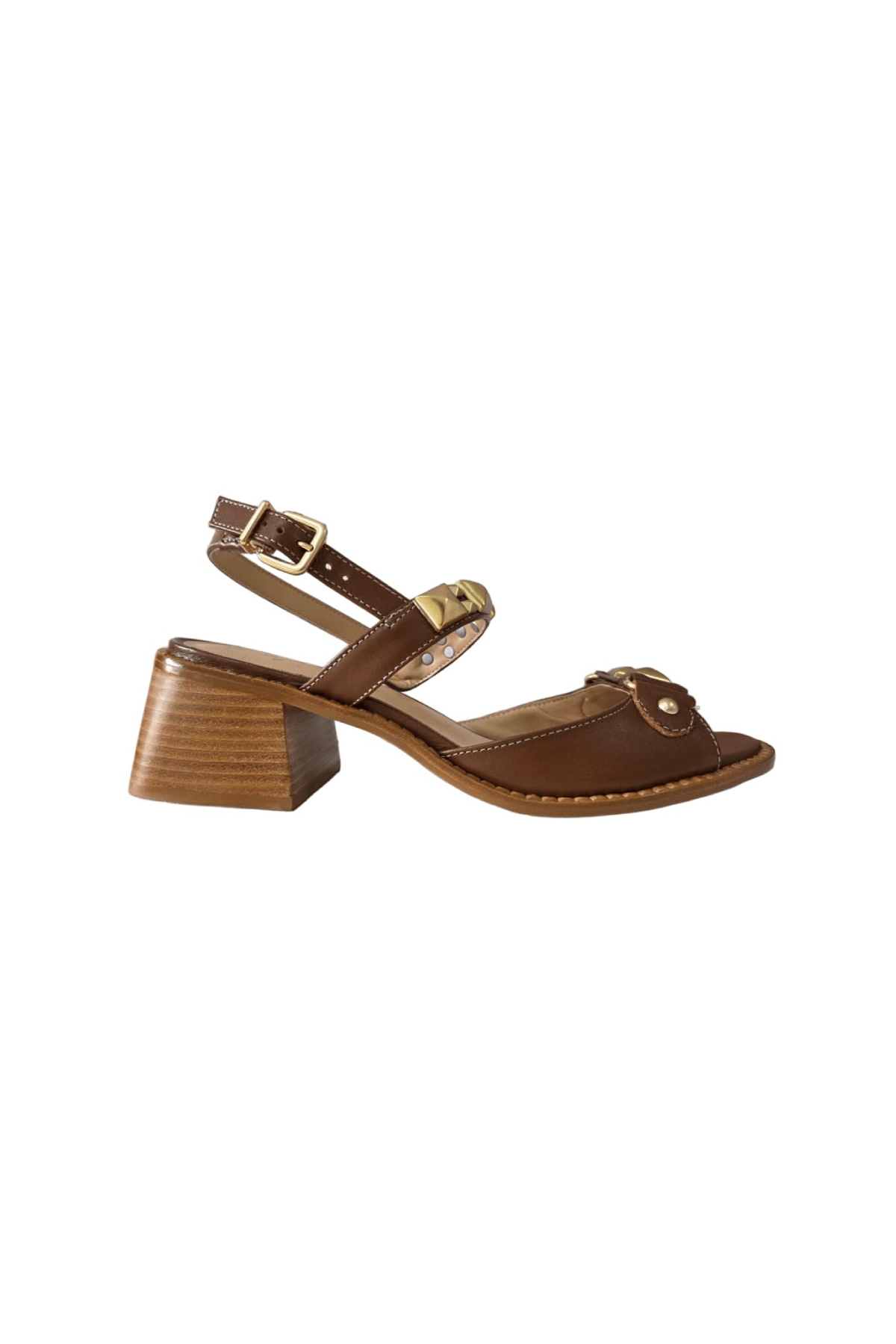 Sandália Salto Bloco Couro Spikes Tira Fivela Marrom