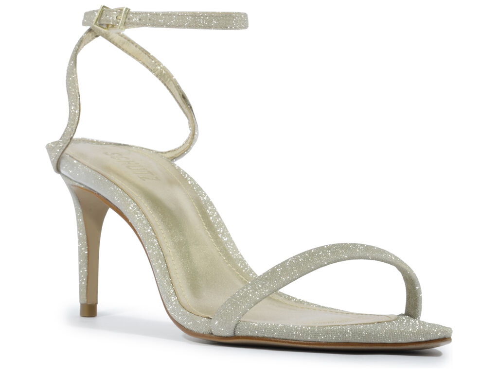 Sandalia Salto Medio Bico Fino Multimaterial Brilho Dourado