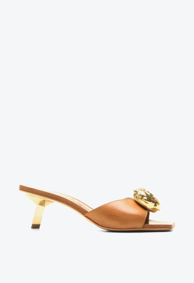 Tamanco Lorena Salto Baixo Aplicação Couro Camel